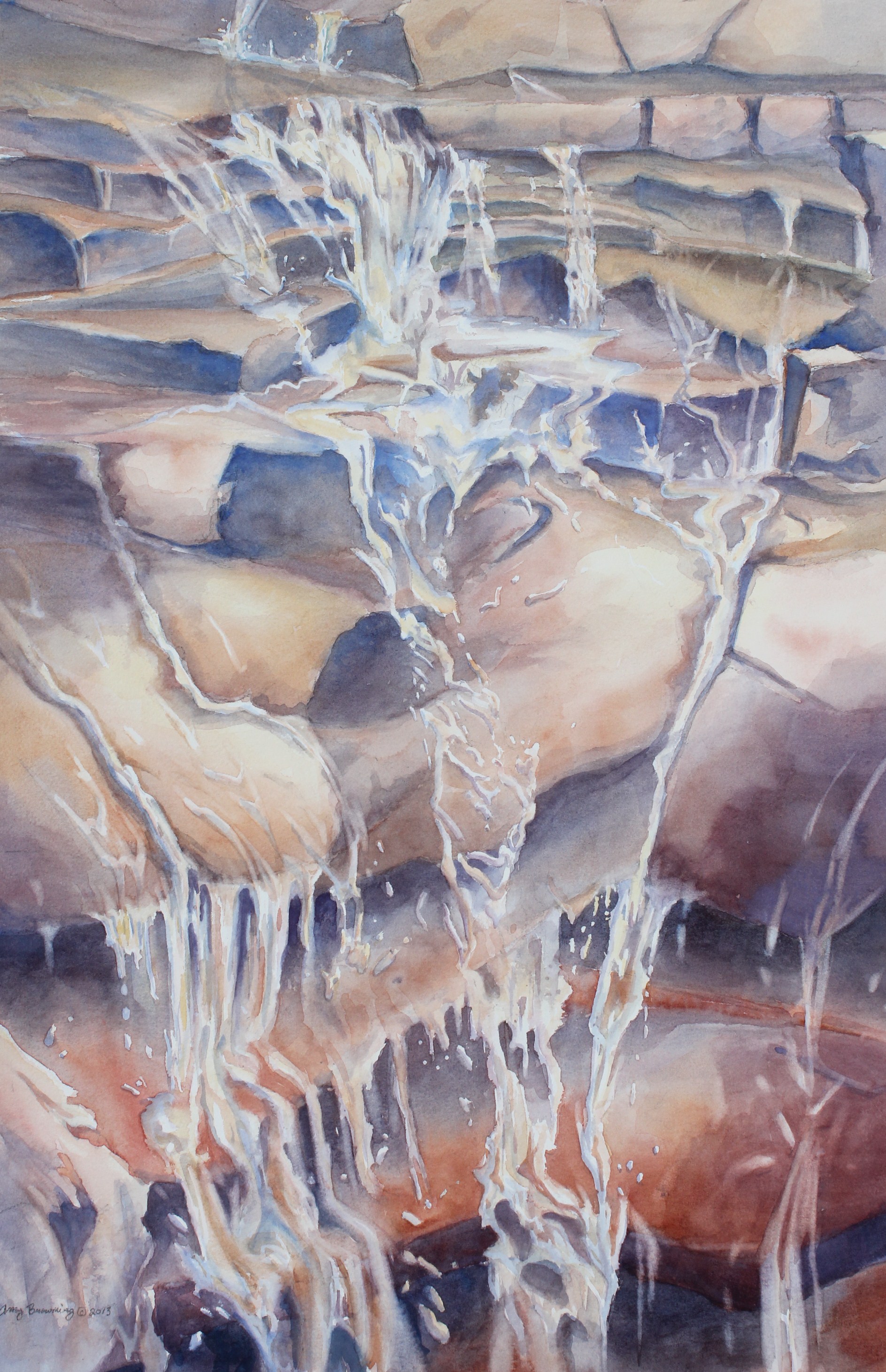 My series of water paintings seeks to capture the abstract qualities of water and reflections, shapes and forms that will change in a fleeting moment. Moreover, these paintings are imbued with a deep appreciation for creation and a love for symbolism and allegory. Together these paintings visually narrate a story of water and creation. Several of the paintings illustrate the early chaos of the unformed world through designs that lean heavily on abstraction (i.e. Fury of Water I, II and III and Sunlight Dancing on Still Water). As the “world” takes form and is given order, the paintings take on a more representational style (Creation Emerging). Much of the content of the paintings as well as several of the titles (Springs Gush forth in the Valleys) were inspired by descriptions of water in the Psalms.