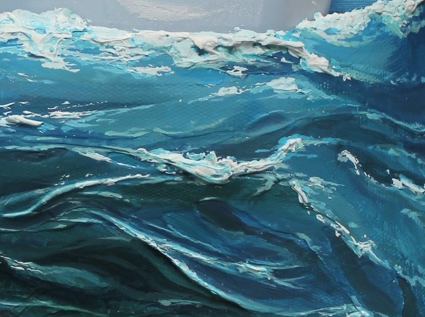 After this second coat of gesso, I could paint the seascape. I worked the painting dark to light, like I would any other acrylic painting. When I felt I was nearing the completion of the painting, I mixed gel and white paint together to paint the foam on the crests of the waves using a palette knife. I’m pretty happy with the result of this little experiment and am in the process of trying a new composition. I’m using the wire mesh again but this time added papier maché to the outside of the wire mesh before I gessoed it. I hope to share that one with you when I am finished.