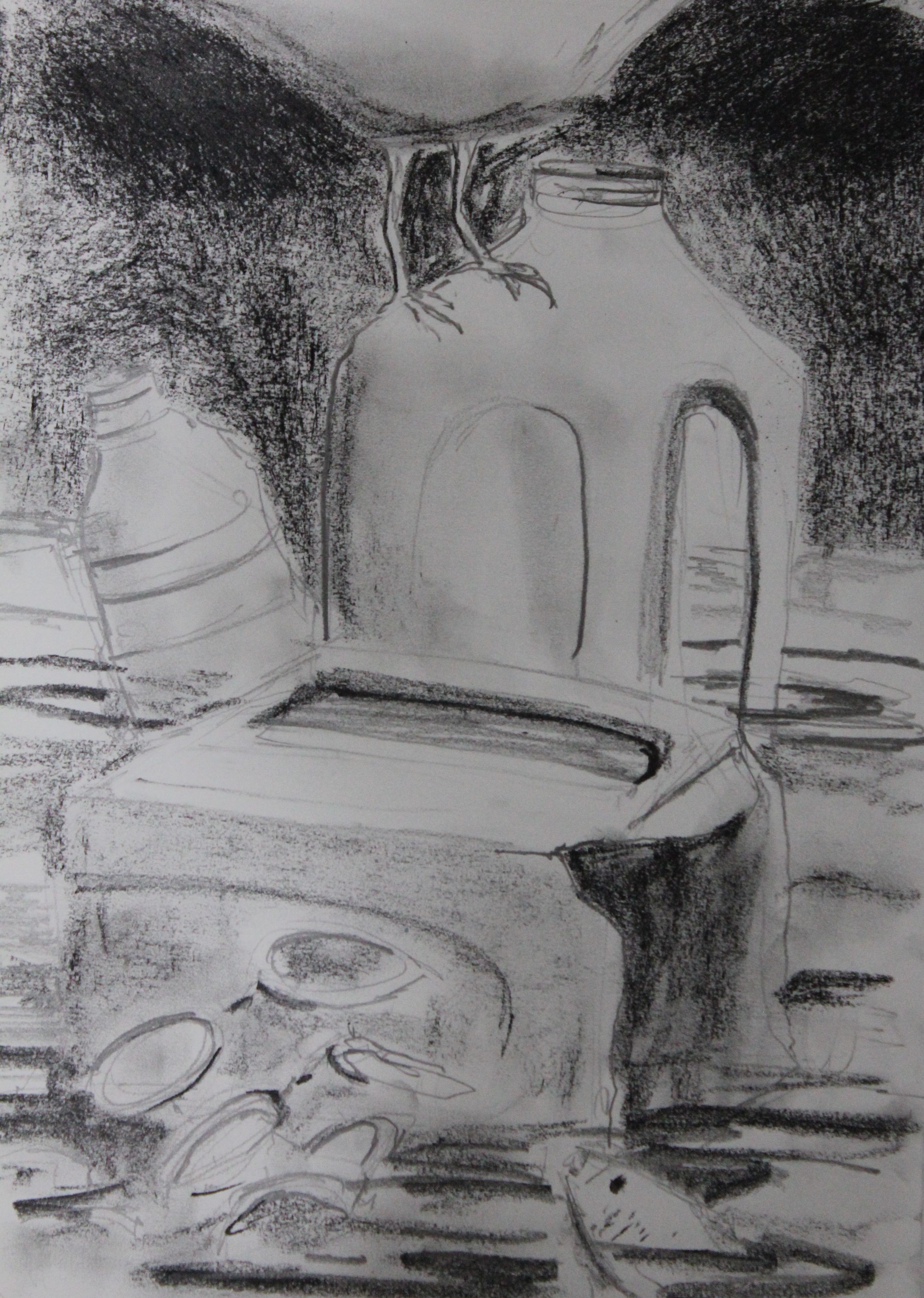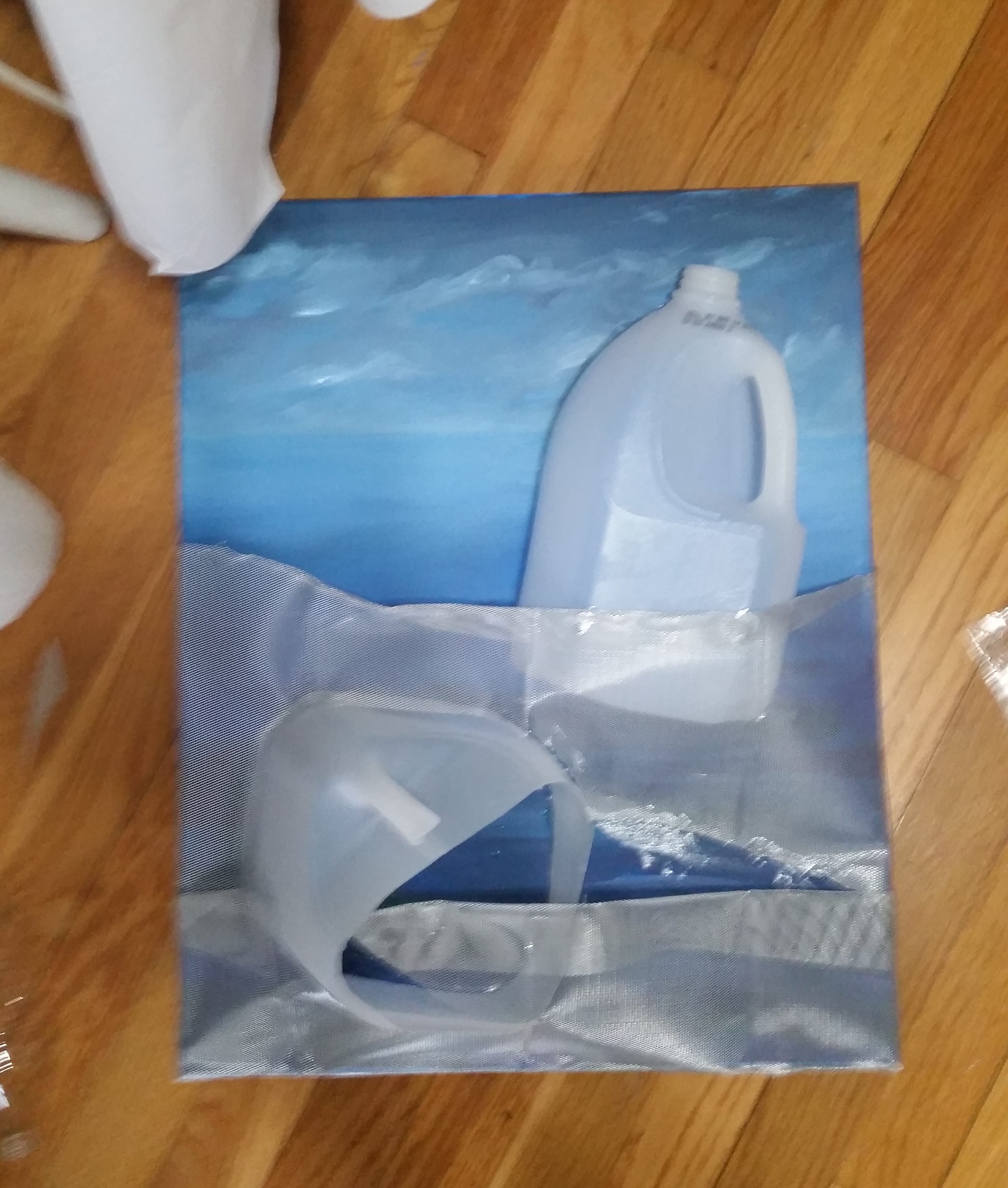 Then I had an idea! A Max Ernst piece (Two Children are Threatened by a Nightingale), which combined painting and wood elements, gave me the idea to combine acrylic painting with 3-Dimensional objects. Why not use my subject matter as part of my painting? The next painting session I spent cutting up my jug and trying out ways to arrange it on canvas. Two jugs later I had my composition. I cut one in half vertically and used the bottom half of the other. I glued them onto the canvas using E6000, the strongest glue I knew existed.