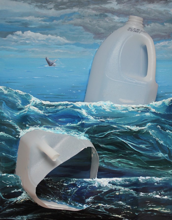 After hearing how the plastics we were sending overseas for “recycling” were being dumped into the waterways, I knew I wanted to create a piece about the plastics polluting our oceans. I started planning a limited palette watercolor painting featuring plastic milk jugs and a disposable water bottle along with some sea life. I collected plastic milk jugs for my reference material and began my painting. I sketched in my design and began laying in the initial washes. Everything was going fine, but the painting just was not speaking to me. I left it for awhile and walked away, ruminating how I could make it different.