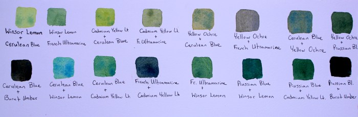 A chart of my favorite mixtures of blues and yellows to create various shades of green. All colors are Winsor and Newton Watercolors.
