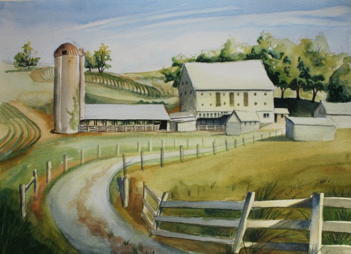 Another painting of a farm in Maryland. I used ultramarine blue for the greens in the fields and trees but used cerulean blue on the mountain in the background. (Sold)