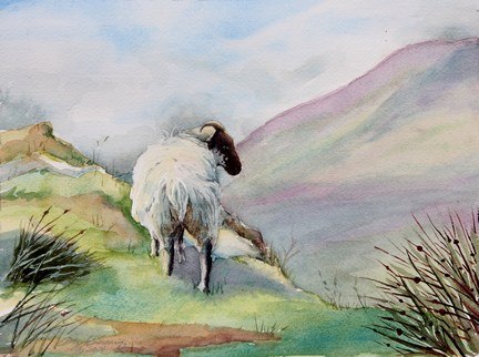 A painting of the Ring of Kerry, Ireland. I used cerulean blue mixed with various yellows to achieve the greens in this painting. The green of the hills in the back were painted with mostly cerulean blue to achieve the hazy look. (This painting has sold.)