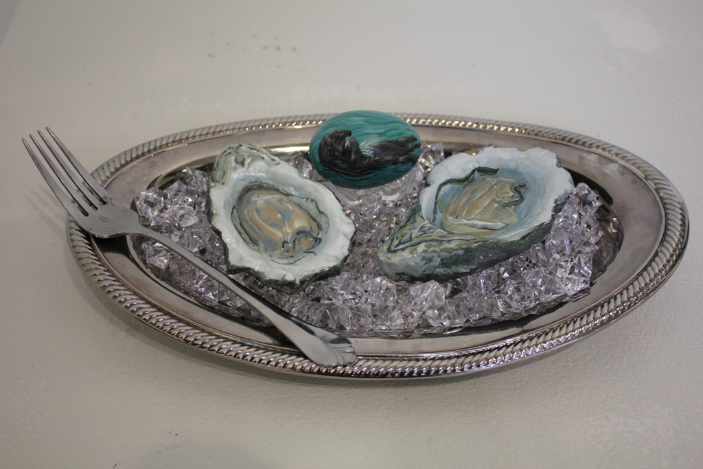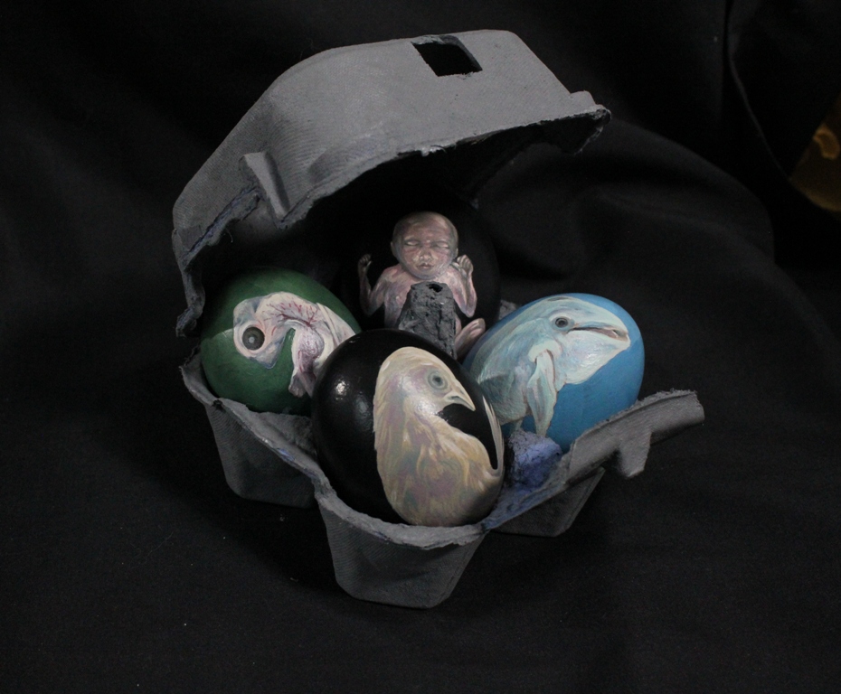 These are two of the arrangements that pull my artist statement together, which is that human life is as dependent upon and as fragile as the rest of the environment. The oysters in the sculpture/painting on the left were sculpted with wire, papier mâché, and gesso. This work represents the toxins that can enter food sources through improper water treatment, crop fertilization, or manure runoff. The egg carton on the right is symbolic of the safety and protection of the mother’s womb, but of which all sorts of toxins and threats can penetrate. I will write more about these works in the future.