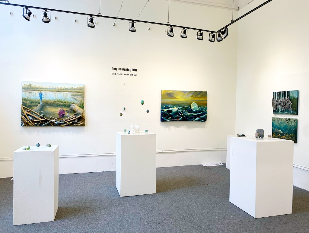 Above is a sampling of how I chose to exhibit the works. Photography, unfortunately, fails to exhibit how 3-Dimensional the artwork actually is. The works on canvas and board were hung traditionally, while at least half the number of eggshells were hung from wires strung across the ceiling. The centerpiece of one arrangement of coral reef life was a sculpture of bleached coral made from papier mâché, gesso and eggshells. The rest of the eggshells I displayed on egg stands set on pedestals.