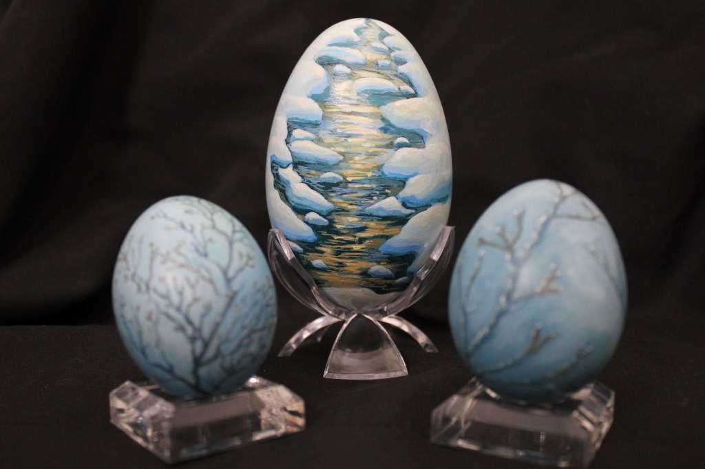 “Dormant”, “Unwind the Water’s Chains” and “Bone-Brittle Branches” Acrylic on Eggshells