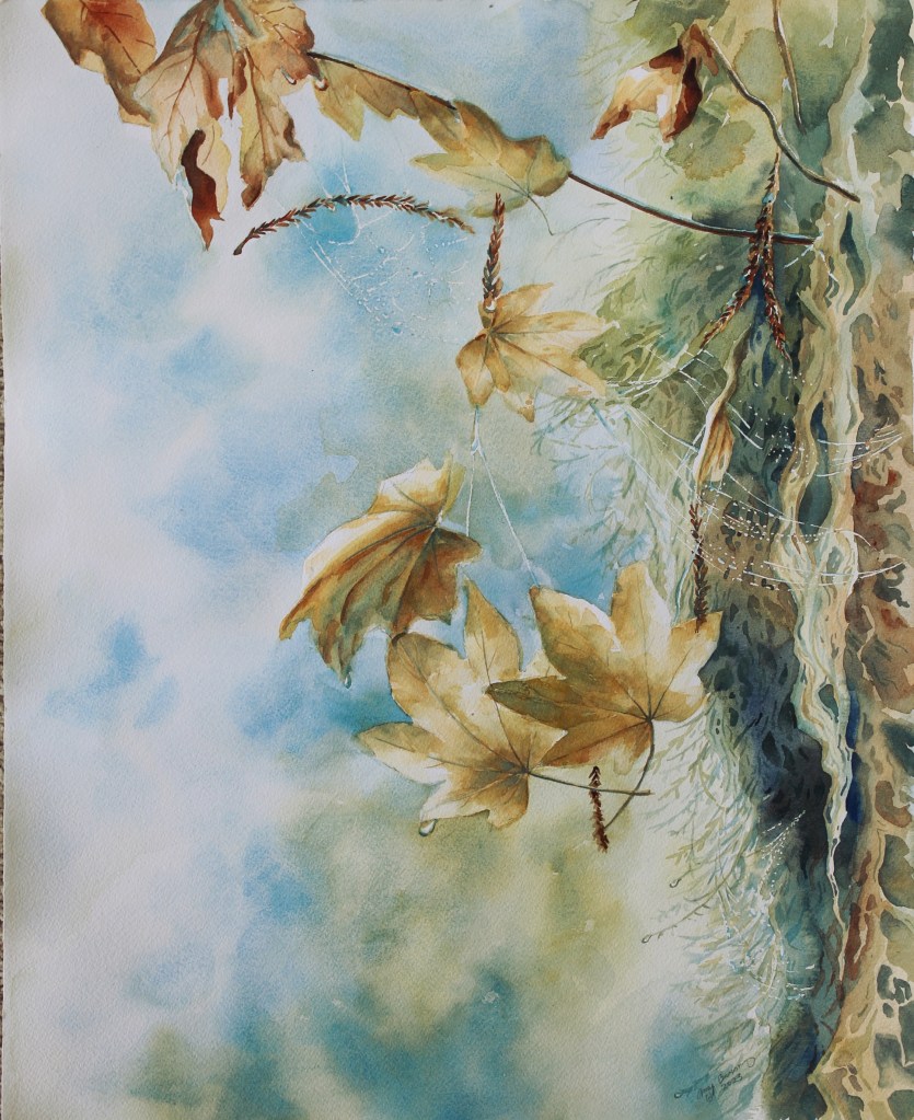 “Leaves Fallow and Softly Fall” Watercolor painting inspired by the Old English word “fallow” and Rilke’s poem, “Herbst” (Autumn).