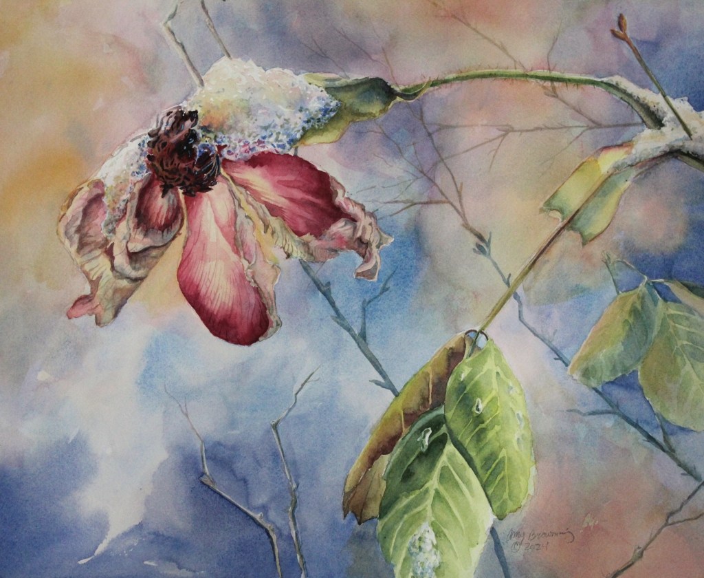 After photographing the rose, the imagery wouldn’t leave me, and the lingering snow prompted me to start a painting before the snow melted. Some people like to curl up with a book on a snow day (which I do at times), but snow always inspires me to grab a cup of tea and my paints and to start creating. Somehow, it’s the halting of the busy activities and setting aside media and replacing these with moments spent drinking in the beauty around you, that you feel that “glow more intense than blaze of branch, or brazier”.